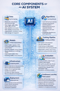 Unlock the hidden engine behind Artificial Intelligence. Explore the core components of an AI system—data, algorithms, models, pipelines, and infrastructure—in a detailed, 1500-word guide designed for students, professionals, and tech enthusiasts.